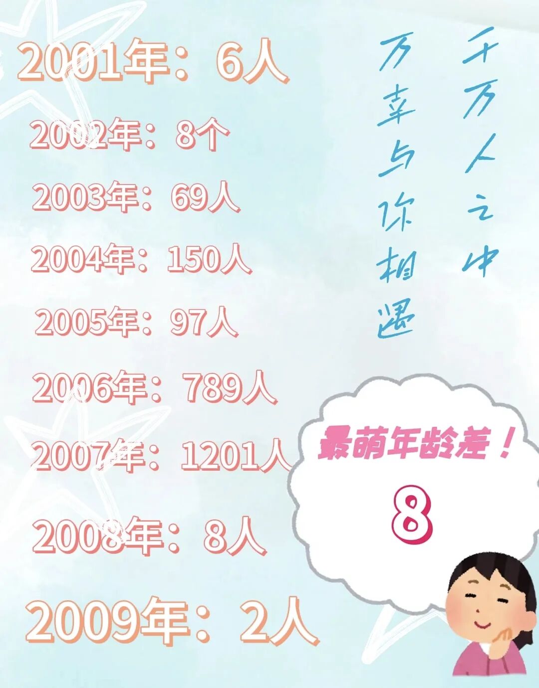 欢迎走进2025新生年龄的趣味天地!今年新生里,2007年出生的同学占比超半,达51.55%,是当之无愧的“主力星群”。年龄最大的是2001年的沉稳“领航哥”,最小的是2009年的朝气“萌新弟”,8岁最萌年龄差超有爱。
