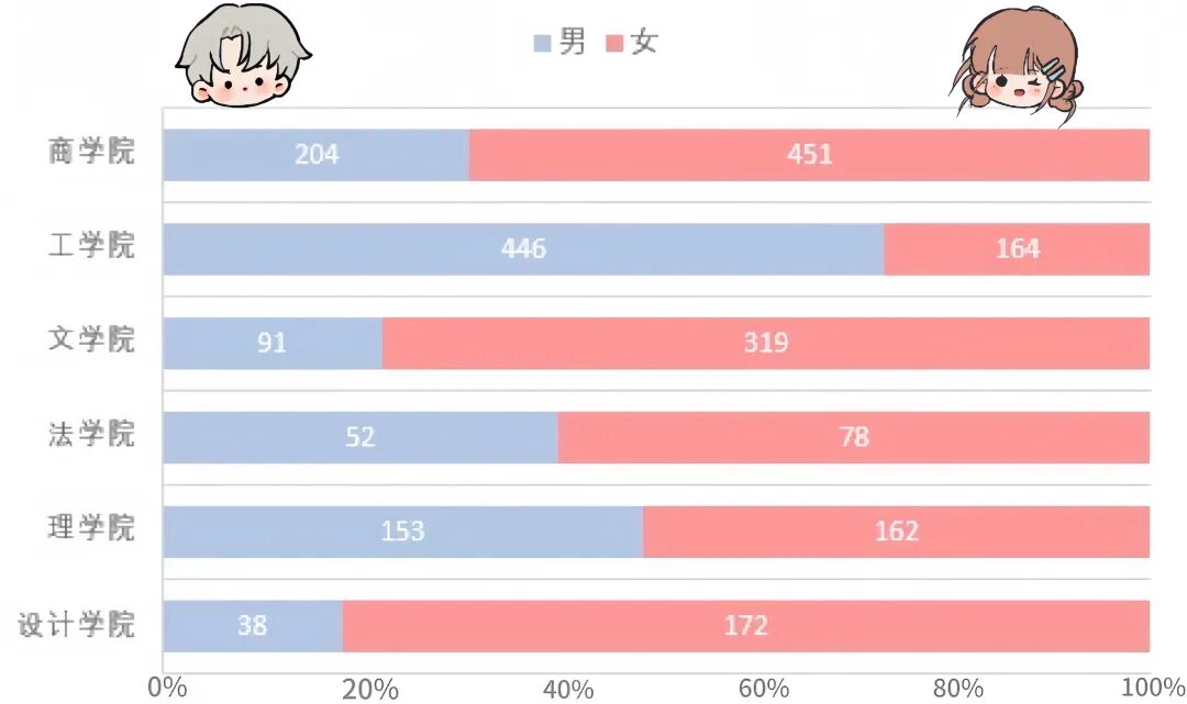 时光流转,今年院系人数格局依旧,商学院、工学院、文学院稳坐前三。理学院男女比例渐趋和谐,法学院亦在均衡之路上稳步前行。设计学院则以近1:5的男女比脱颖而出,荣膺“桂冠”。