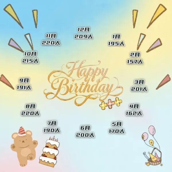 8月和11月出生的小伙伴超有默契,人数精准持平,220人齐摘“生日人数之最月份”桂冠。还有八位幸运儿,生日恰好与祖国母亲的生日——10月1日“撞了个满怀”!