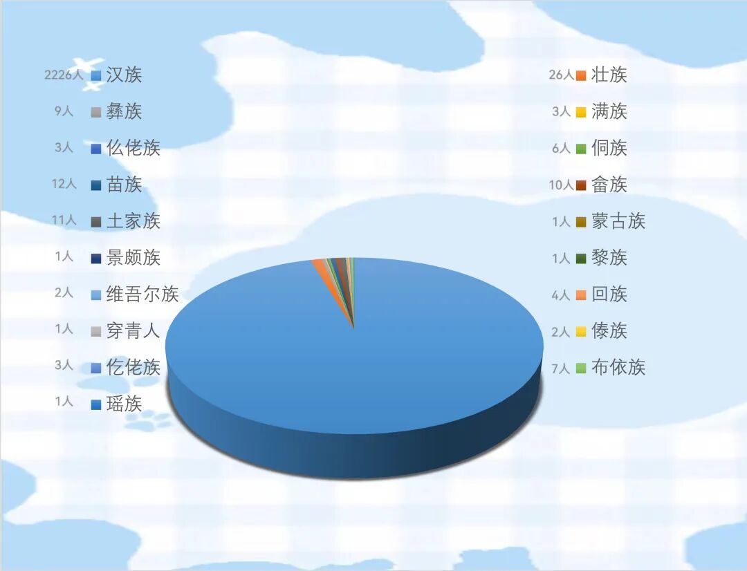 18个少数民族的104位小伙伴,也如同各具特色的“文化小使者”,欣然加入这个大家庭。壮族有26人,像热情似火的活力舞者,浑身散发着蓬勃朝气;苗族12人,似灵动轻盈的山间飞鸟,带着自然赋予的清新灵动;畲族10人、土家族11人,如坚韧与热情完美融合的独特音符,为校园乐章增添别样旋律。景颇族、黎族、蒙古族等独特民族也纷纷现身,带着各自民族独有的文化密码。