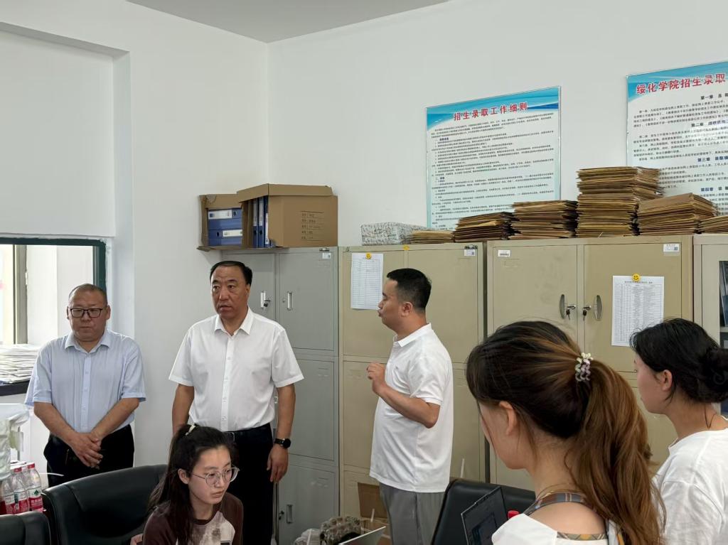 7月18日上午,学校党委书记刘峰、党委副书记卢百胜深入招生录取现场,亲切慰问坚守在一线的招生工作人员,实地指导录取工作。