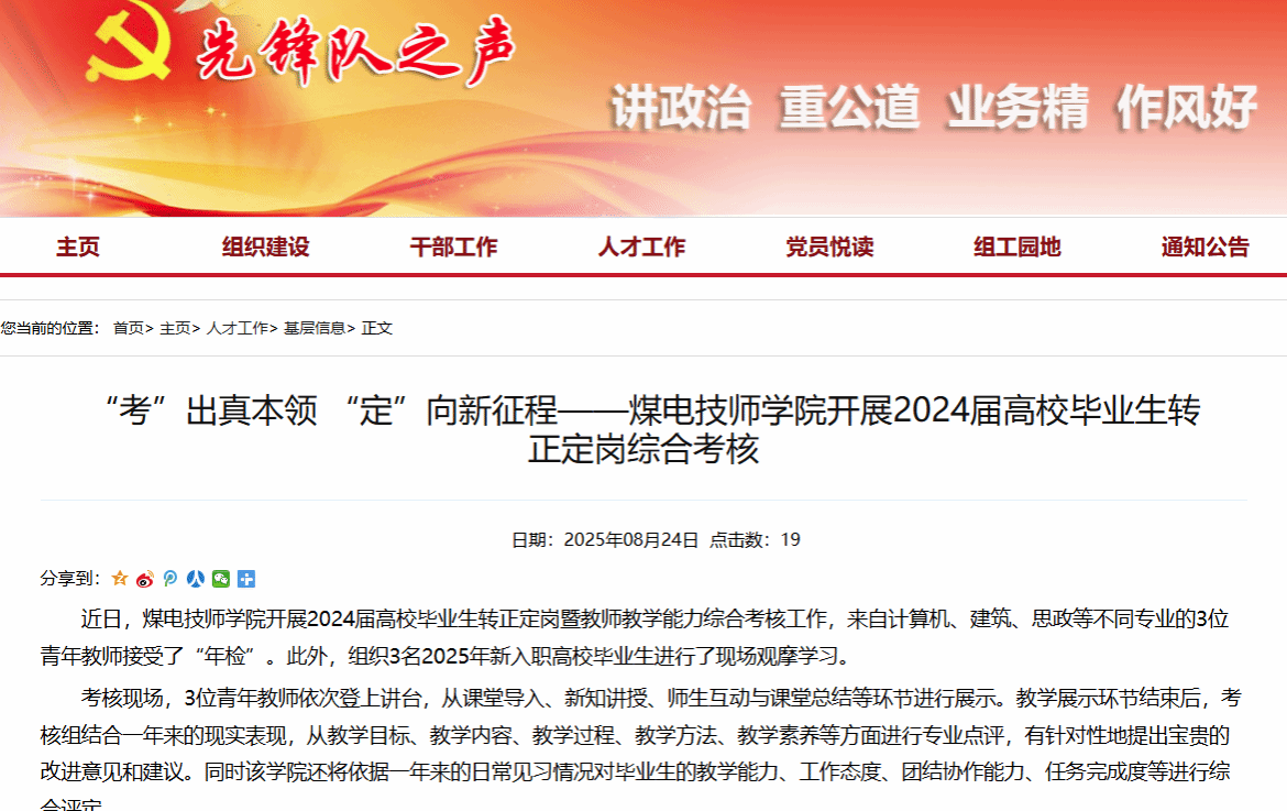近日,煤电技师学院开展2024届高校毕业生转正定岗暨教师教学能力综合考核工作,来自计算机、建筑、思政等不同专业的3位青年教师接受了“年检”。此外,组织3名2025年新入职高校毕业生进行了现场观摩学习。
