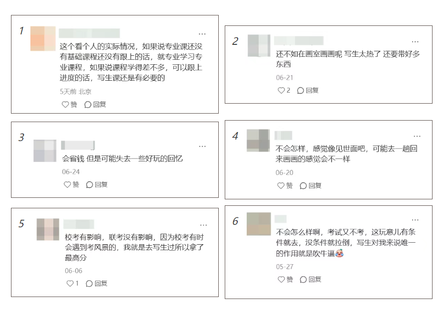 可能很多同学会考虑到写生通常会持续1-2周,这段时间无法进行常规的应试科目训练(如画室里的三科模拟),还需要额外支付写生期间的交通、食宿、门票等不小的费用支出。因此会不太想参加画室写生。根据往年学长学姐的经验总结来看,不参加写生对联考成绩没有非常大的影响,如果我们不想参加写生,一定要提前找画室老师沟通。