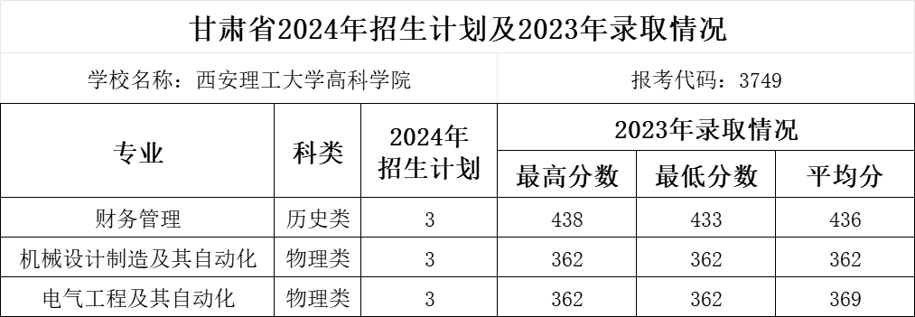 西安理工大学高科学院在甘肃省2024年招生计划及2023年录取情况