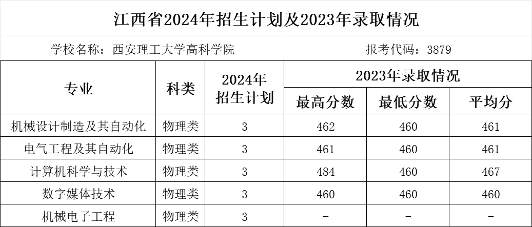 西安理工大学高科学院在江西省2024年招生计划及2023年录取情况