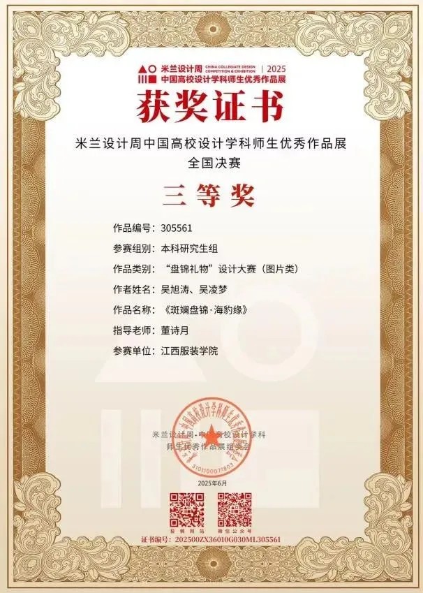 新闻中心讯(供稿/教务处)近日,由中国教育国际交流协会、中国高等教育学会联合主办的第9届米兰设计周·中国高校设计学科师生优秀作品展圆满落幕。江西服装学院师生作品在大赛中脱颖而出,参赛作品总数超100件。其中,由动画教研室杨弋杰老师指导,余莹颖、贾星宇、许媛同学共同创作的参赛作品《彩韵自然》荣获国赛二等奖;由动画教研室董诗月老师指导,吴旭涛、吴凌梦同学共同创作的参赛作品《斑斓盘锦·海豹缘》荣获国赛三等奖;另有6组学生创作的参赛作品斩获江西省赛区一等奖1项,二等奖1项,三等奖4项。