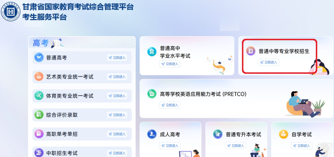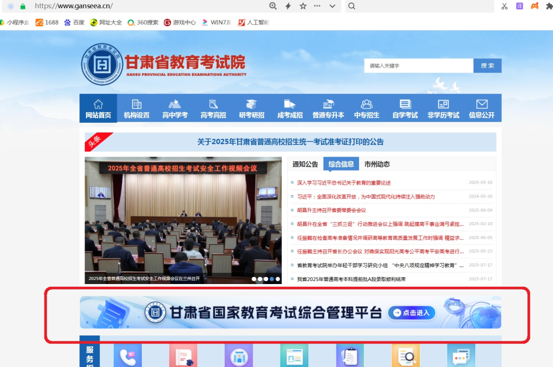 第1步:即日起,考生使用电脑,在浏览器中打开甘肃省教育考试院官方网站(https://www.ganseea.cn/),选择“甘肃省国家教育考试综合管理平台”点击进入。