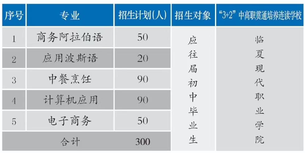 临夏现代职业学院中专部2025年开设商务阿拉伯语、应用波斯语、中餐烹饪、计算机应用、电子商务5个中职专业。