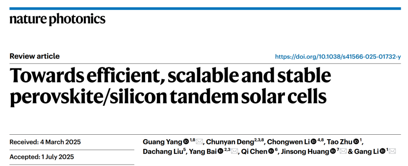 8月14日,深圳理工大学材料科学与能源工程学院副教授白杨团队联合香港理工大学、美国北卡罗来纳大学教堂山分校等高校科研团队,在国际顶级期刊Nature Photonics发表综述论文,系统梳理并深入分析了钙钛矿/晶硅叠层电池在效率提升、稳定性增强与规模化制造三大关键维度的技术瓶颈及解决策略,为推动这一前沿技术构建商业化闭环提供了系统性的技术路线图。