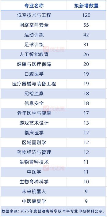 2025年度普通高等学校本科专业申报新增数量较多的专业包括低空技术与工程、网络空间安全、运动训练、足球训练、人工智能教育和健康与医疗保障。这些新增专业的数量反映了当前社会对这些领域专业人才的需求和重视程度,涵盖了工程技术、信息安全、体育训练、人工智能和医疗健康等多个学科领域。