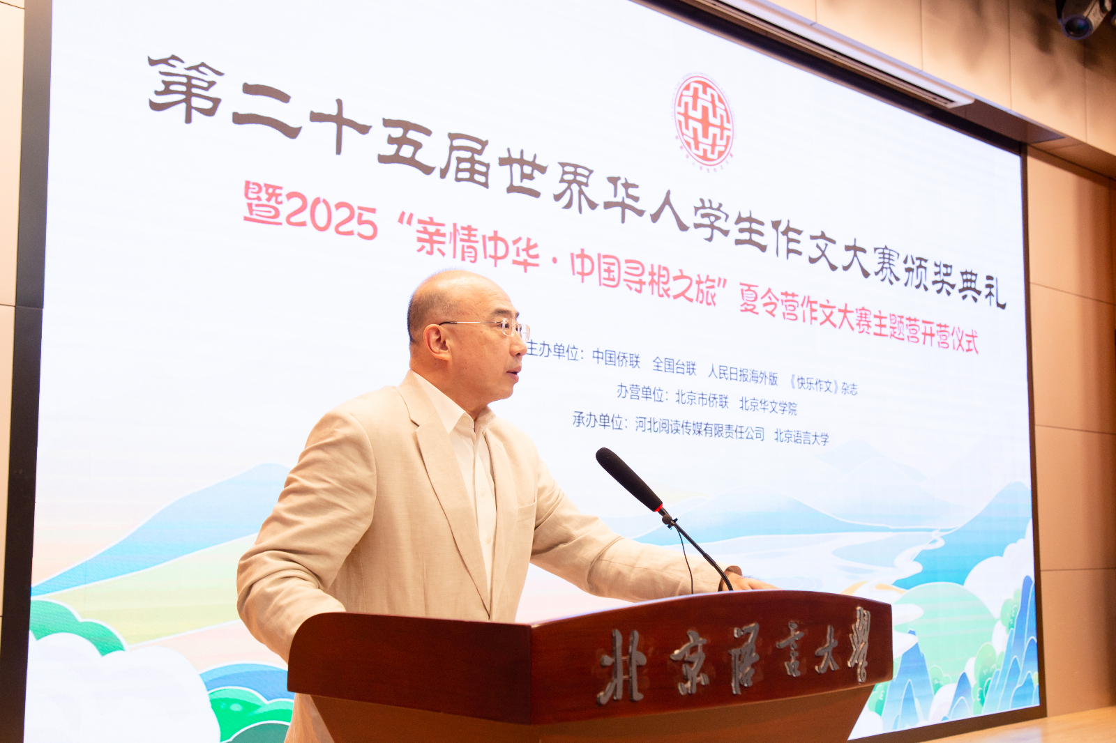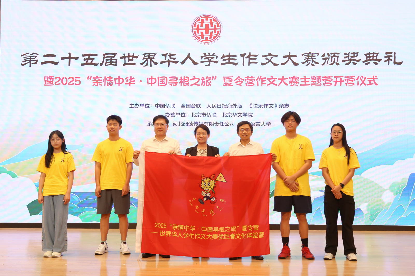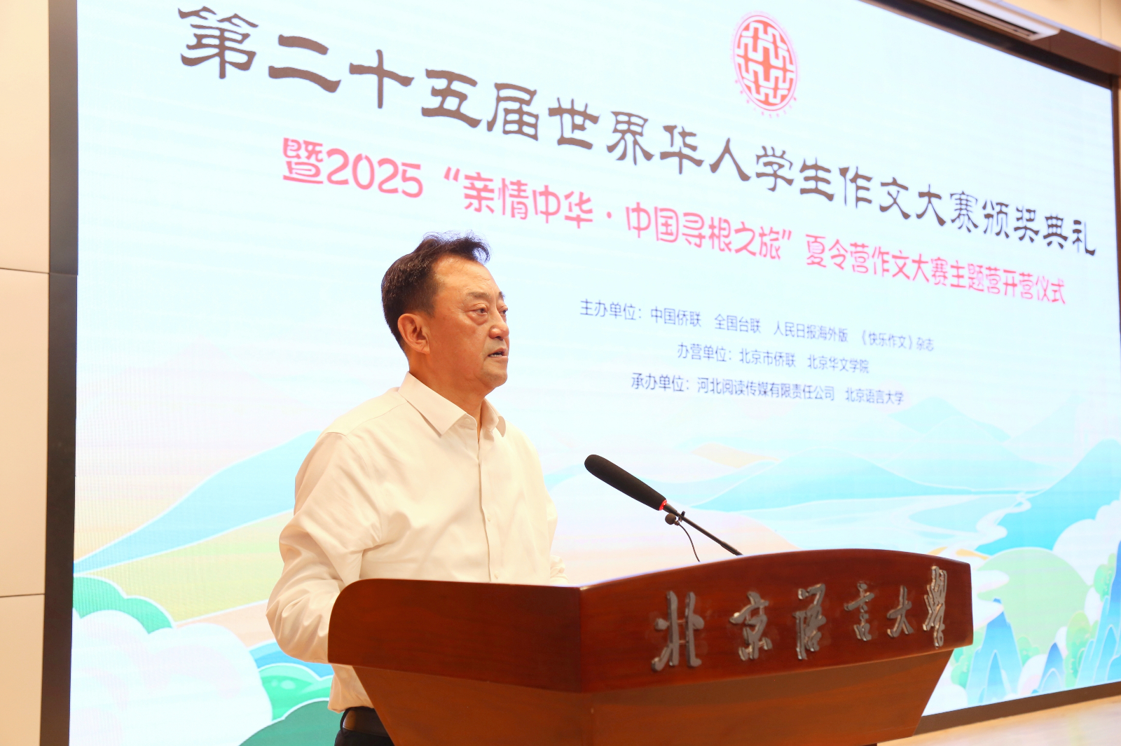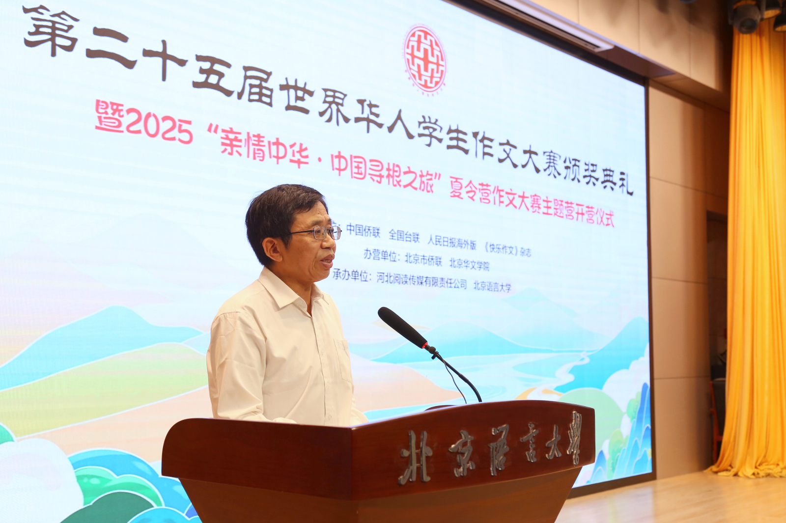 以青春之我,筑中华之梦。7月20日,由中国侨联、全国台联、人民日报海外版、《快乐作文》杂志共同主办的第二十五届世界华人学生作文大赛颁奖典礼暨2025“亲情中华·中国寻根之旅”夏令营作文大赛主题营开营仪式在北京语言大学举行。中国侨联党组成员、副主席候选人高峰,全国台联党组书记、中国侨联兼职副主席纪斌,人民日报海外版科教部副主任熊建和世界华人学生作文大赛组委会秘书长、河北阅读传媒公司总经理关平等主办单位领导,北京市侨联党组书记周景晓、北京华文学院党委书记张衍前、北京语言大学党委书记倪海东等承办单位主要负责同志出席活动。北京语言大学教授、第十届茅盾文学奖获得者、大赛专家咨询委员会顾问梁晓声出席活动并授课。中国侨联文化交流部副部长郭启华主持颁奖仪式。