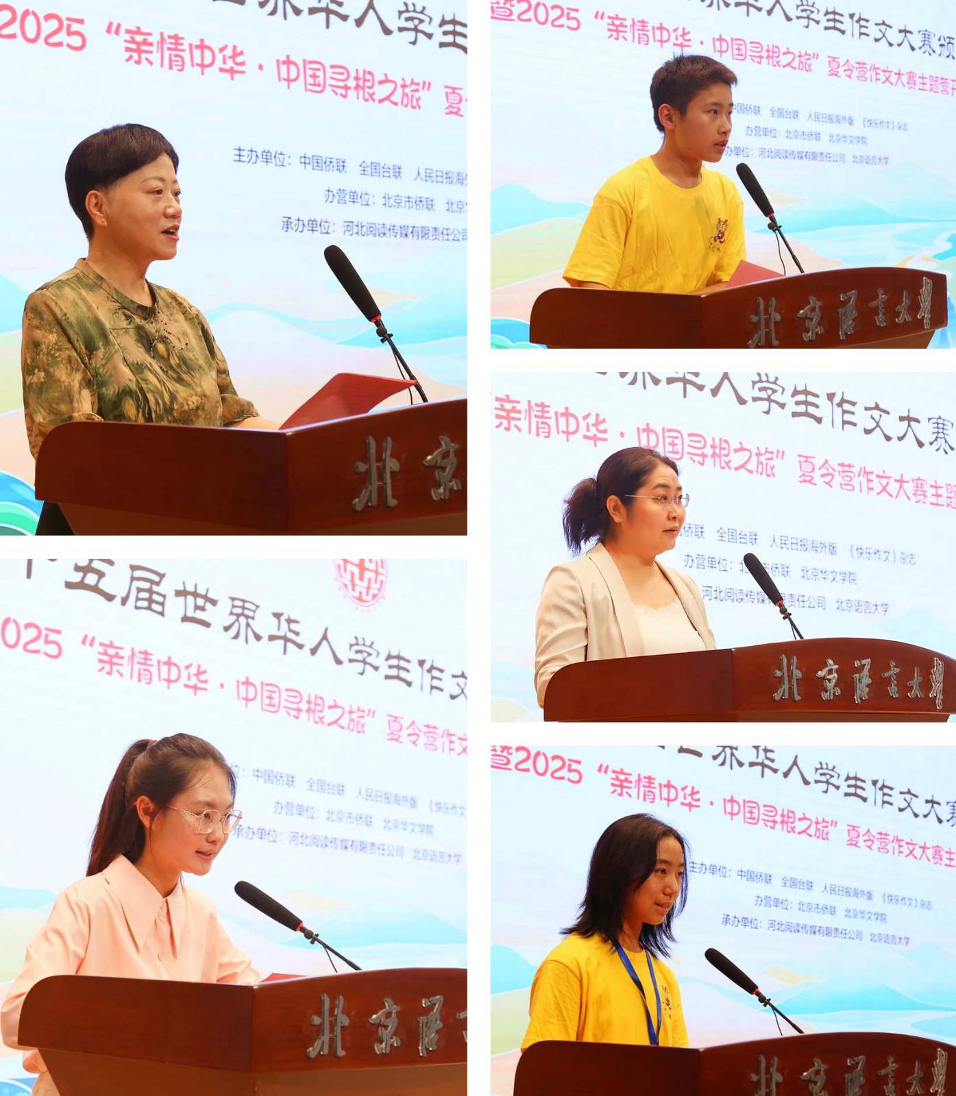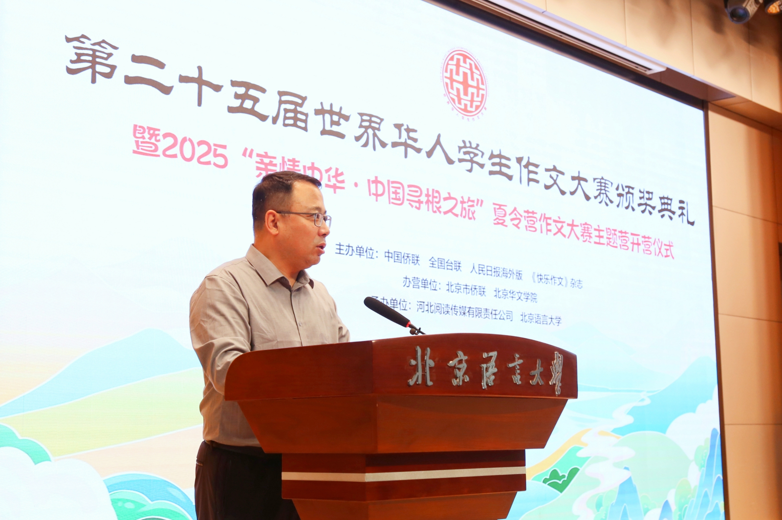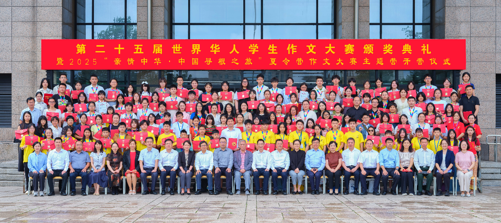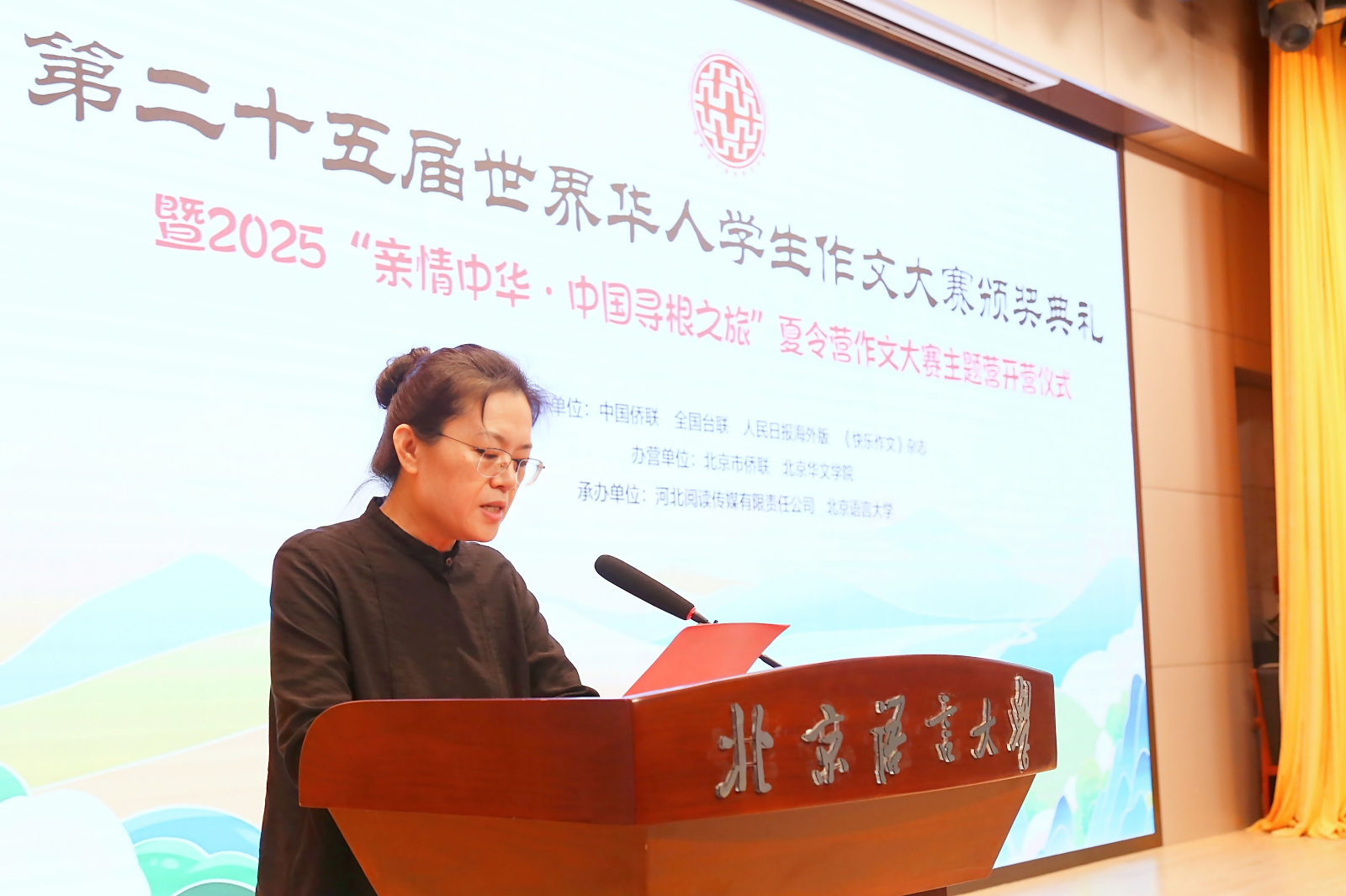 以青春之我,筑中华之梦。7月20日,由中国侨联、全国台联、人民日报海外版、《快乐作文》杂志共同主办的第二十五届世界华人学生作文大赛颁奖典礼暨2025“亲情中华·中国寻根之旅”夏令营作文大赛主题营开营仪式在北京语言大学举行。中国侨联党组成员、副主席候选人高峰,全国台联党组书记、中国侨联兼职副主席纪斌,人民日报海外版科教部副主任熊建和世界华人学生作文大赛组委会秘书长、河北阅读传媒公司总经理关平等主办单位领导,北京市侨联党组书记周景晓、北京华文学院党委书记张衍前、北京语言大学党委书记倪海东等承办单位主要负责同志出席活动。北京语言大学教授、第十届茅盾文学奖获得者、大赛专家咨询委员会顾问梁晓声出席活动并授课。中国侨联文化交流部副部长郭启华主持颁奖仪式。
