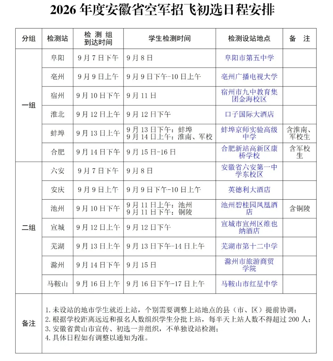 根据2026年度空军招飞工作安排,9月8日至9月17日,空军招飞局南京选拔中心将派初选组赴各地市,对报考空军飞行学员的学生进行检测。