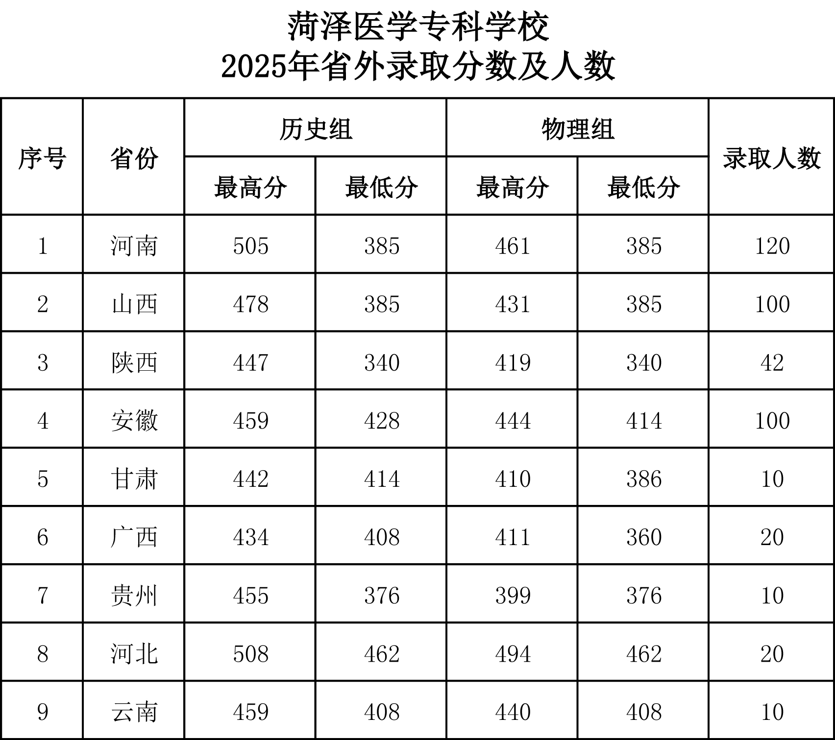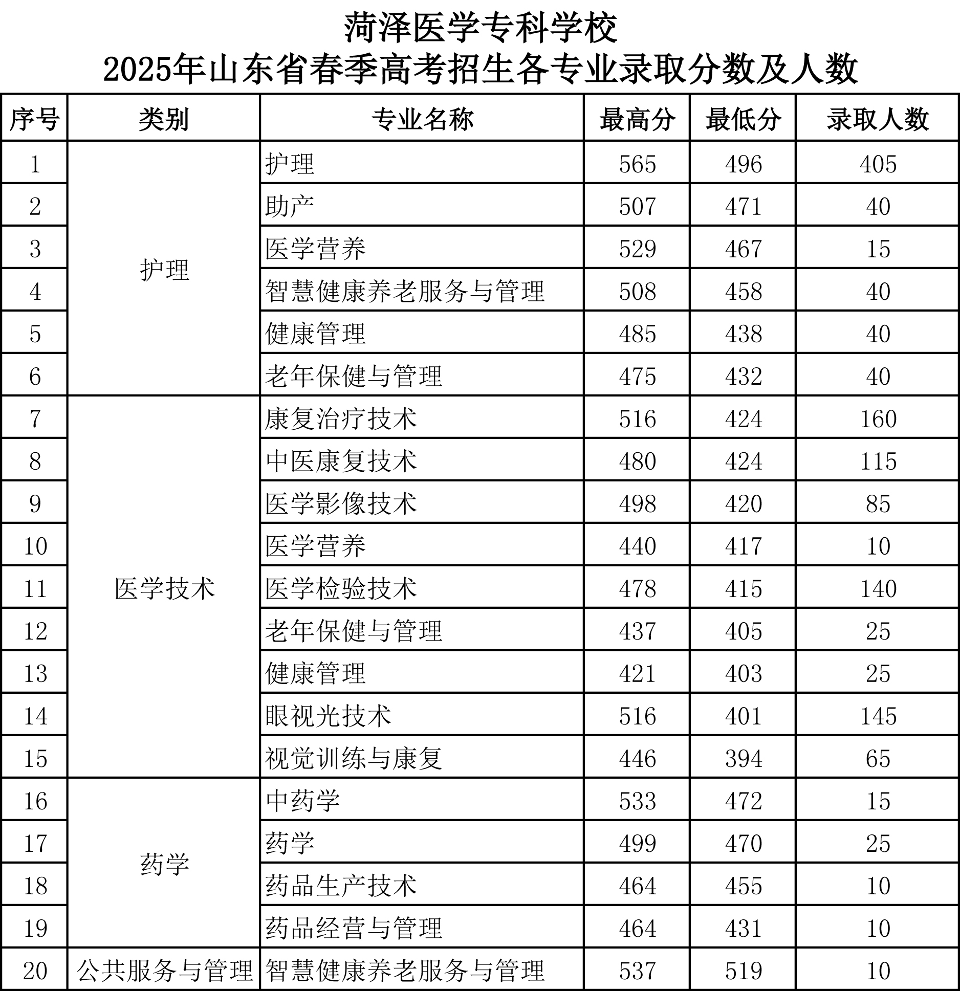 菏泽医学专科学校2025年各类型招生录取分数及录取人数