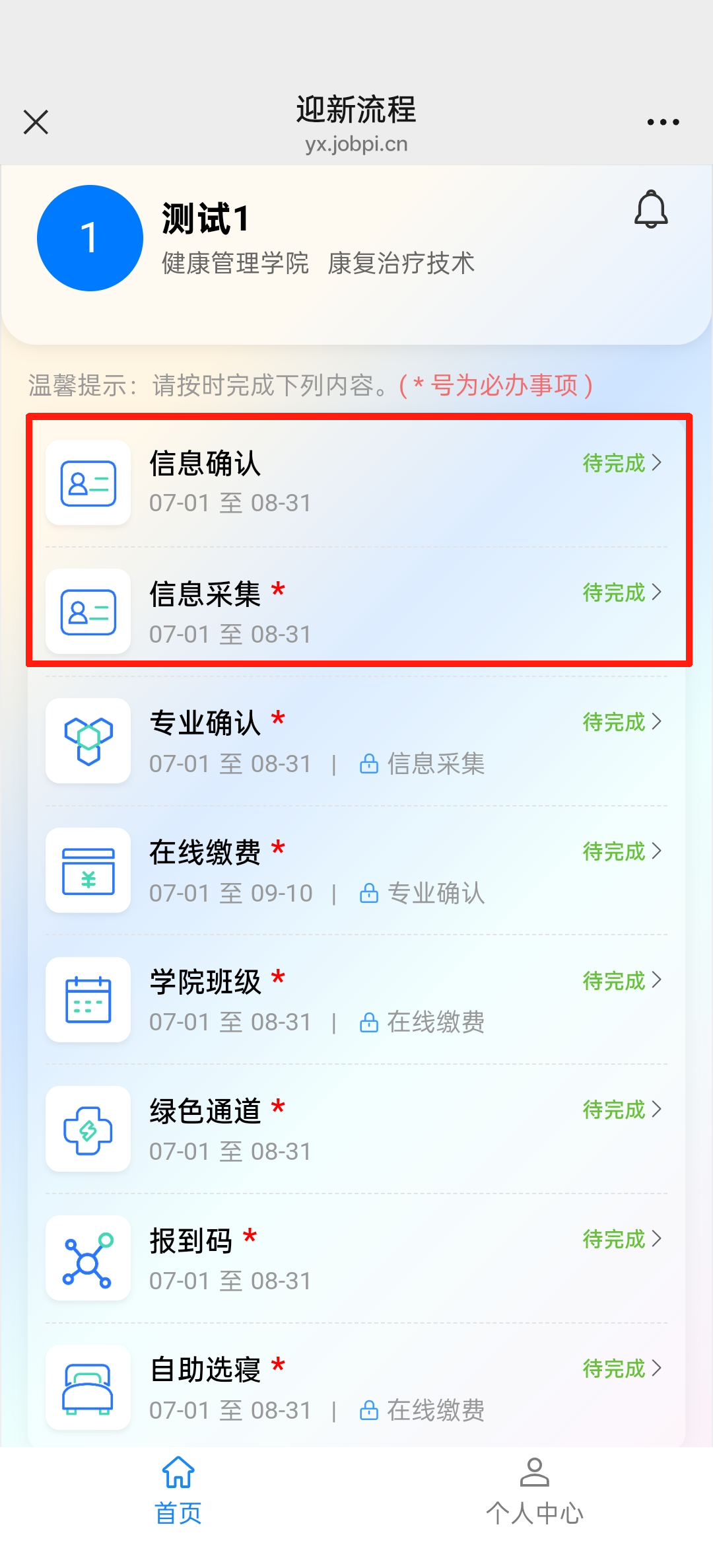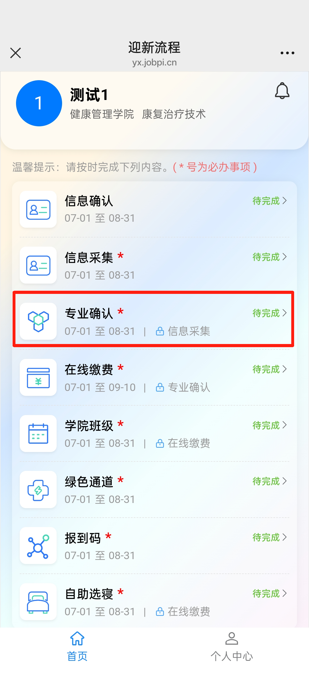 完善个人信息后点击专业确认。专业确认时,每位新同学有且仅有一次自主选择专业的机会,请慎重考虑,一经提交无法修改。