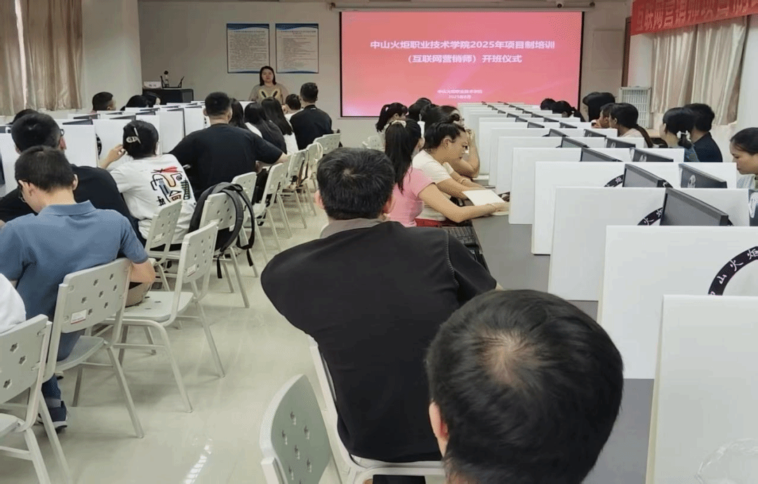 8月17日上午,2025年中山市互联网营销师项目制培训首期培训班在中山火炬职业技术学院实训校区融创楼506室开班。本次培训由中山市人力资源和社会保障局主办、广东省全民数字素养与技能培训基地中山火炬职院承训。来自全市相关行业的60名学员、项目制培训授课教师代表、继续教育学院工作人员共同见证开班仪式,正式开启数字化营销技能提升之旅。