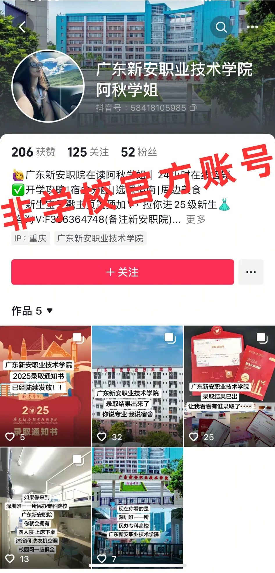 四、我校招生信息官方发布渠道为广东新安职业技术学院网站(https://www.gdxa.edu.cn/)、微信公众号(广东新安职业技术学院、广东新安职业技术学院招生办)、抖音号(新安小招)、视频号(广东新安职业技术学院招生办)、小红书号(广东新安职业技术学院)等已通过认证的官方平台。