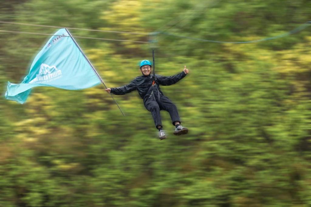 (图十一 泰山科技学院特色全校学生必修课程--营地教育,学生正在进行溜索项目)