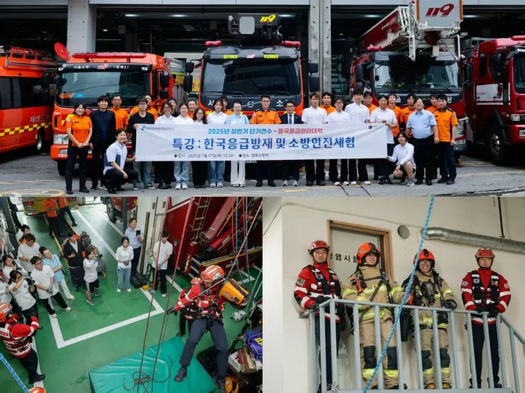 城北区消防署的“韩国防灾应急介绍”课程成为亮点,消防署专家通过案例分析、模拟演练,系统讲解韩国应急管理体系及防灾技术创新。师生们现场体验消防服穿戴、速降装备及救援车辆等救火装备操作,并在监控室直观感受数智时代人机交互的实时监控画面。产学研联动中,师生走访三星创新博物馆、ALUX机器人公司、AI智能博物馆等地,实地考察智能科技在公共服务、文化传承领域的创新应用。文化体验环节则聚焦景福宫、国立现代美术馆的传统建筑防火设计与现代艺术空间安全规划,为跨学科融合提供了新思路。