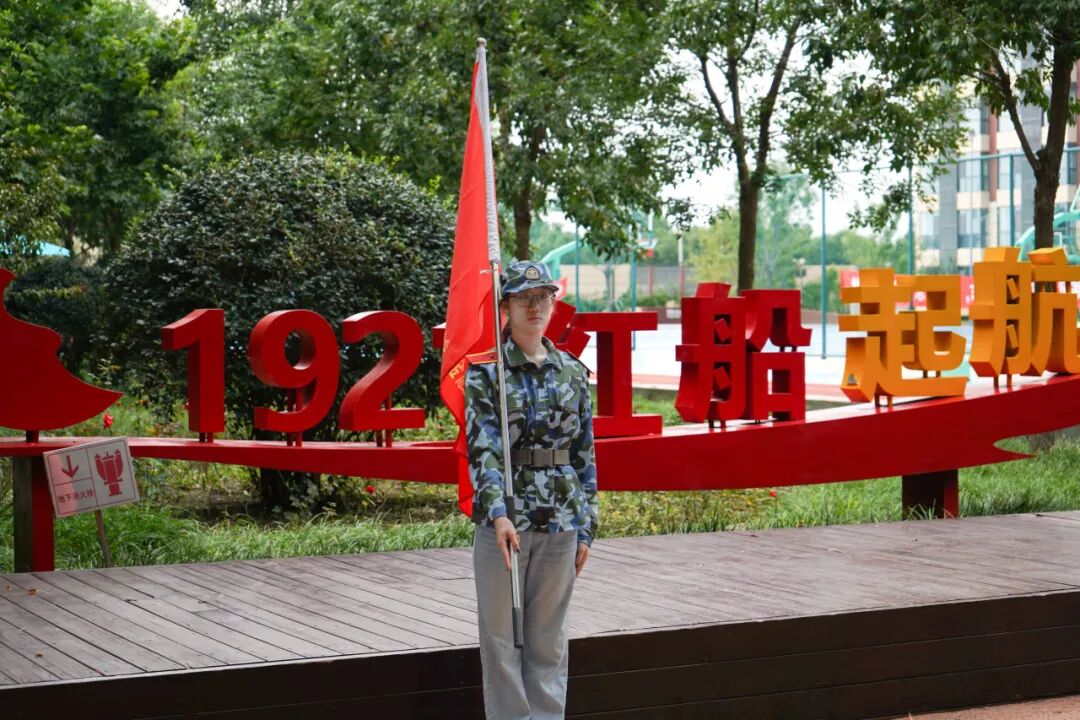 红船边的军训场上,少年们挥着连旗,鲜红旗面如焰,与整齐呐喊的口号声交织成了激昂有力的旋律,同学们以红船为坐标,以红漆为指引,将拼搏的汗水洒在这里,把坚韧的意志刻在了骨子里,他们正以最昂扬的姿态,奋力书写属于新时代的红色篇章。