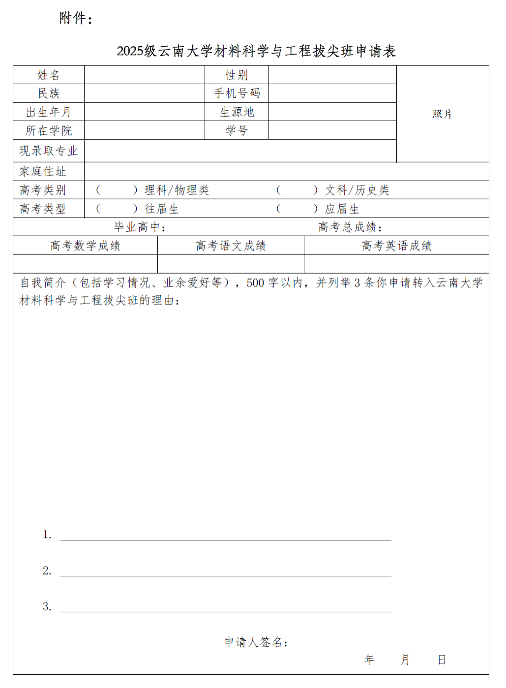 (2)报名方式:可通过网页(https://www.wjx.cn/vm/eEtM8Ta.aspx)在线提交报名申请,并加入2025级材料科学与工程拔尖班选拔QQ群(1056512184),报名后携带纸质申请表(见附件:2025级云南大学材料科学与工程拔尖班申请表)到材料与能源学院教务办公室(材料楼1411)进行现场确认(无纸质材料者视为放弃报名)。