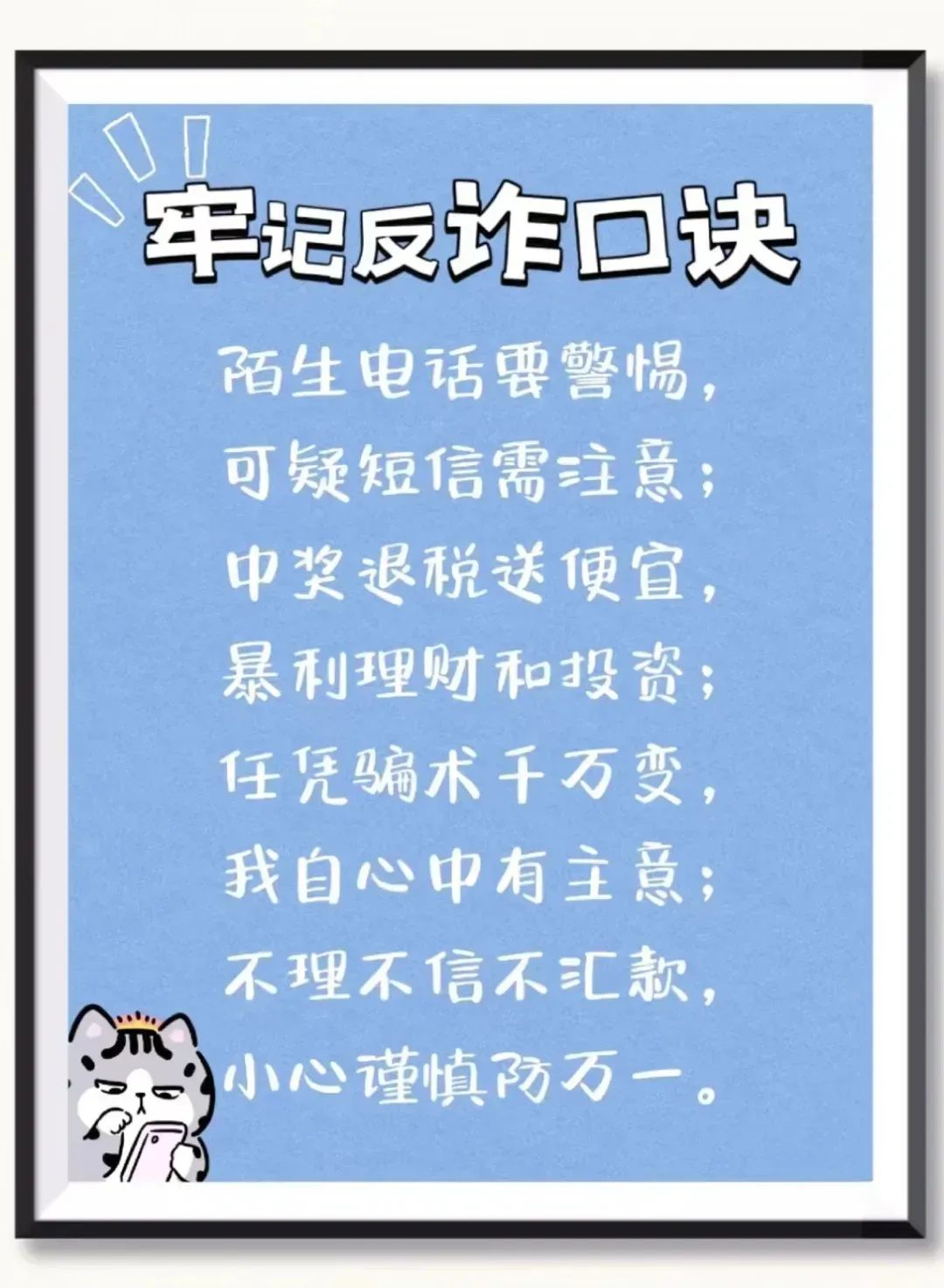 3.提高警惕,谨防冒充客服、快递、公检法、老师、同学、家人、熟人、好友等身份的电信网络诈骗。不向陌生人透露自己及家人的身份证号、住址、存款、银行卡、验证码等信息,不在网络平台贷款,不给陌生人转账、汇款。注意接听反诈中心劝阻电话96110,谨防电信网络诈骗。