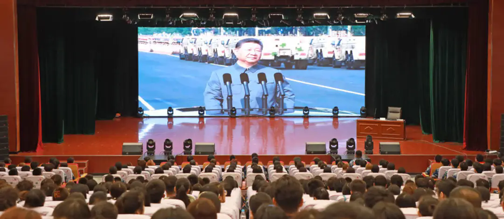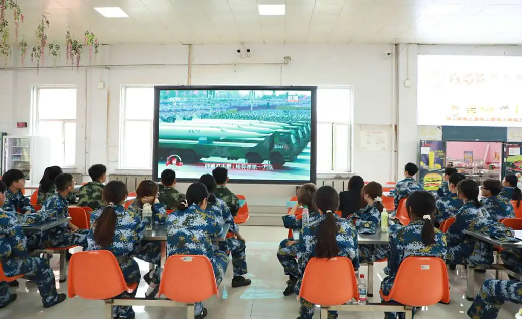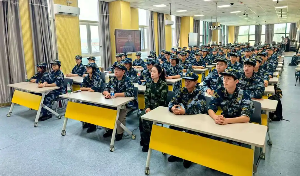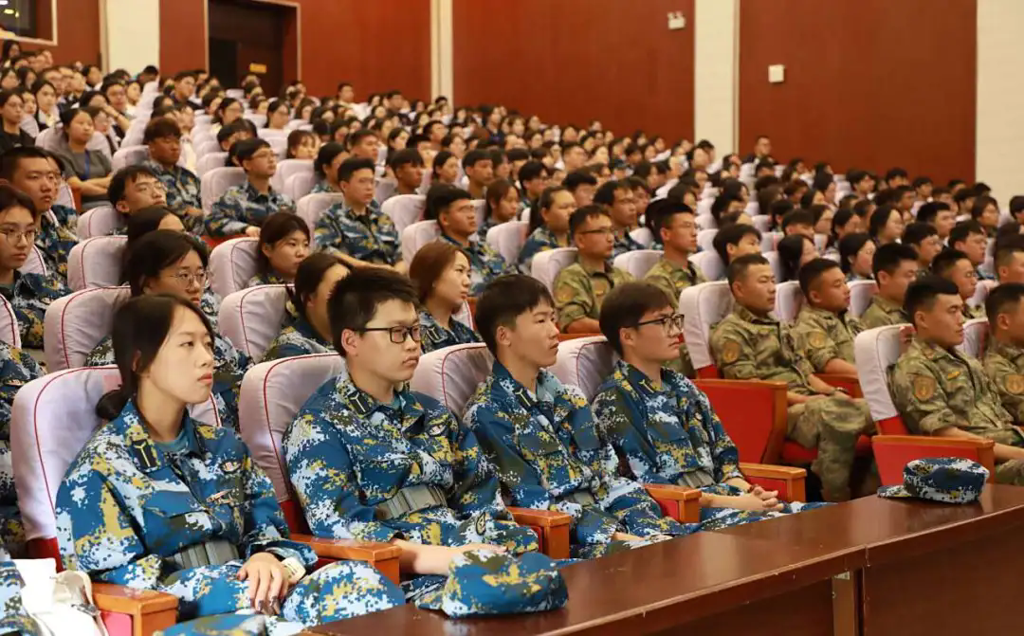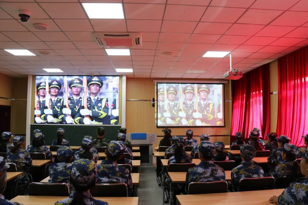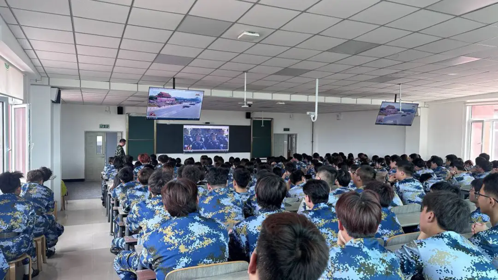 校领导、机关处科级干部在主会场观看直播盛况,正在军训的2025级全体新生、“靖宇”青马班学员、各学院师生在各分会场集中收看。