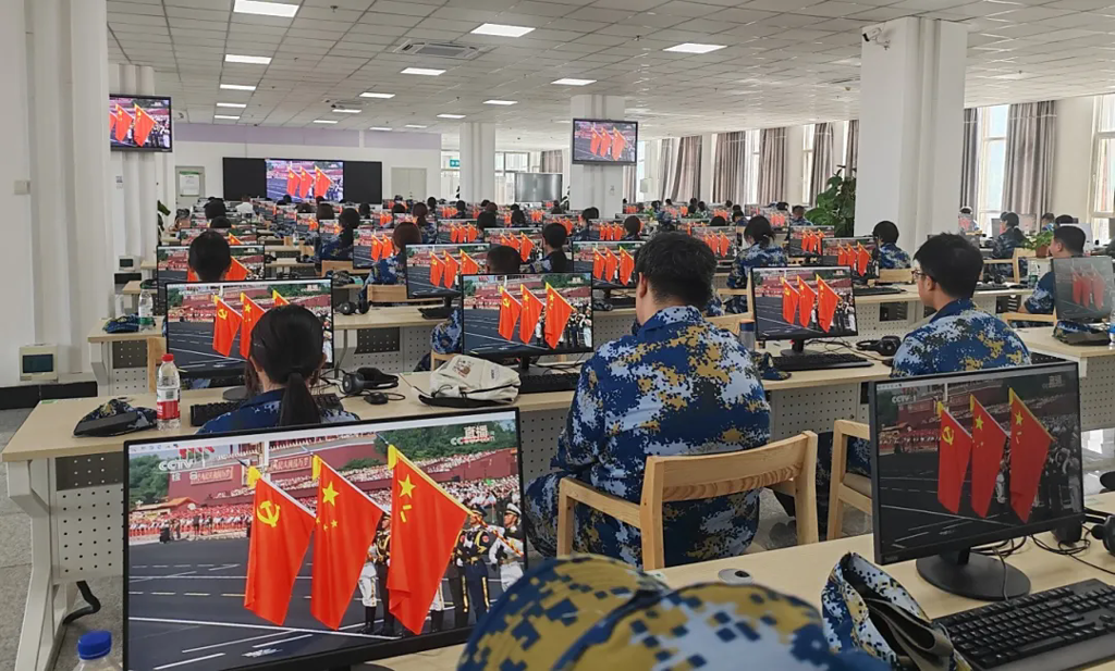 阅兵式上,英姿飒爽的解放军战士、整齐划一的方阵、先进精良的武器装备,让师生们深受震撼,大家全神贯注、情绪高昂,赞叹声不绝于耳。当承载着历史荣光的“战旗方队”浩荡而来,“杨靖宇支队”战旗赫然在列,光荣接受党和人民的检阅,学校各会场热烈的掌声顷刻间爆发,师生心潮澎湃,久久不能平息。