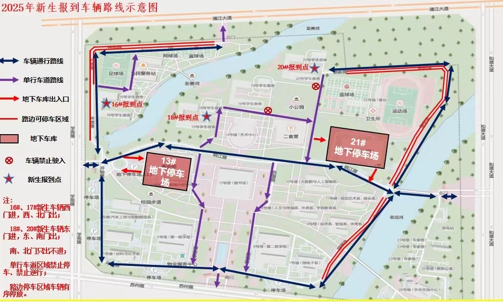 学校在报到期间校内交通实行临时道路管控,具体车辆路线示意图如下。