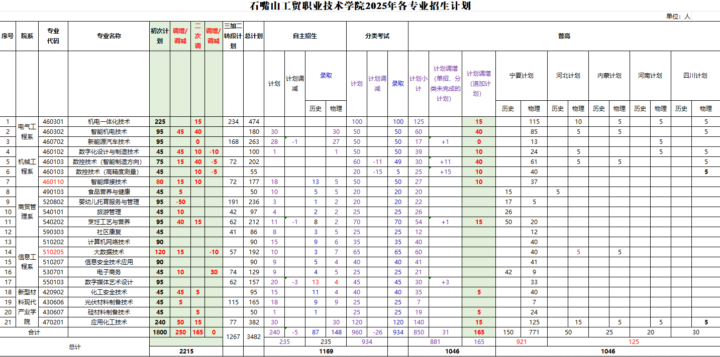 石嘴山工贸职业技术学院2025年各专业招生计划(包含自主招生、分类开始、高考录取、三加二转段)