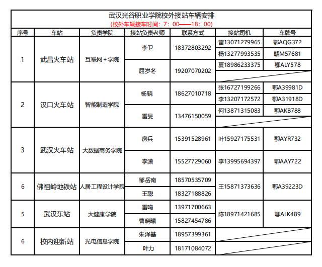 学校在车站(武昌火车站、汉口火车站、武汉火车站、武汉东站、佛祖岭地铁站)设置迎新接站点,并安排专车接送新生。接站负责老师的联系电话详见下图,请各位新生认准学校标识,听从工作人员指引,有序乘车。