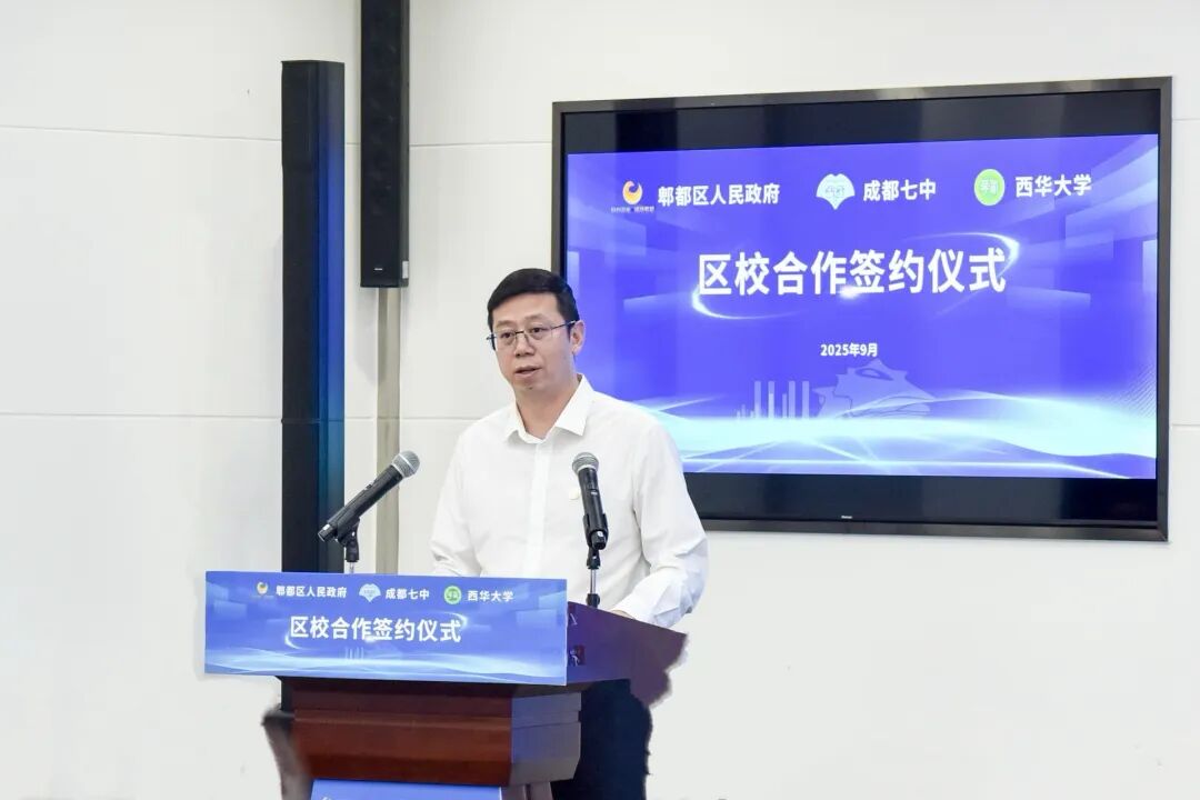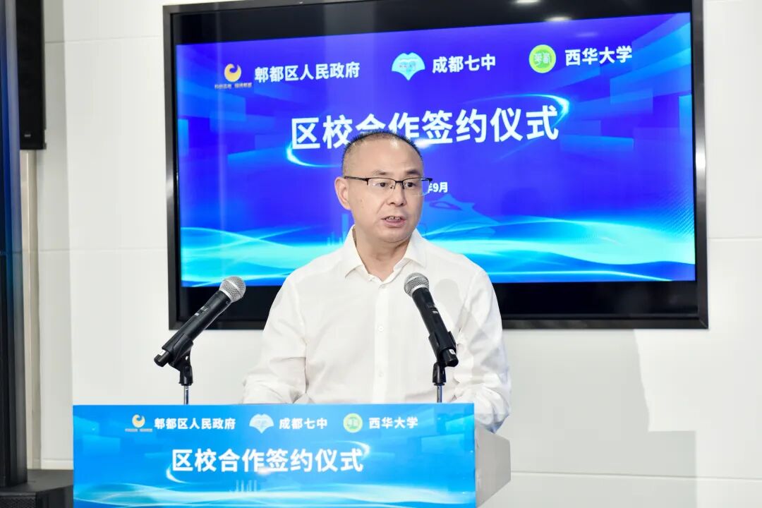 郫都区委书记赵继东致欢迎辞,向长期以来关心支持郫都教育发展的各级领导、高校及中学表示衷心感谢。他表示,郫都区始终坚持办好人民满意的教育,持续增加学位供给、提升教育质量,成效显著。西华大学与成都七中分别是高等教育和基础教育领域的优秀代表,郫都区将全力做好服务保障,推动合作项目落地见效,积极探索资源共享与品牌共建机制,携手打造区域合作办学标杆。
