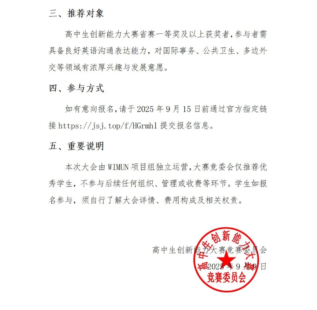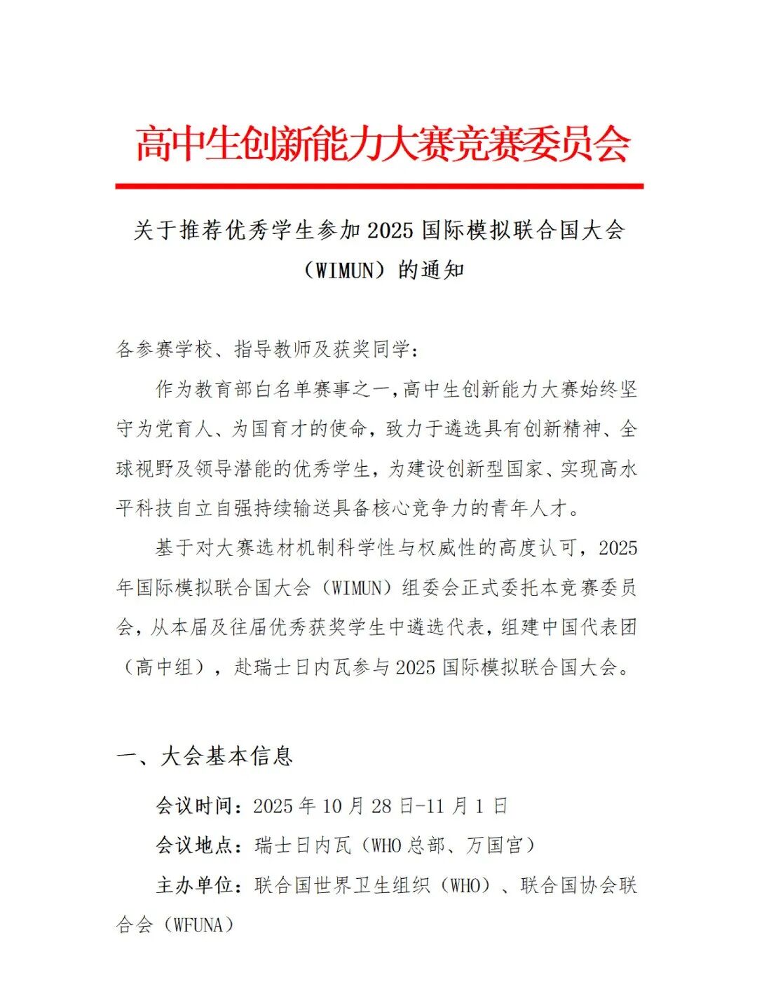 关于推荐优秀学生参加2025国际模拟联合国大会(WIMUN)的通知
