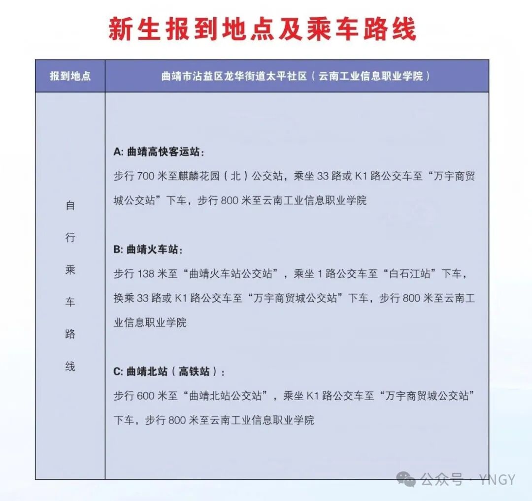 报到期间8:30—17:30,学院在曲靖高快客运站、曲靖火车站和曲靖北站(高铁站)设有新生接待点,请各位同学到云南工业信息职业学院新生接待点后乘接待车抵达学院。
