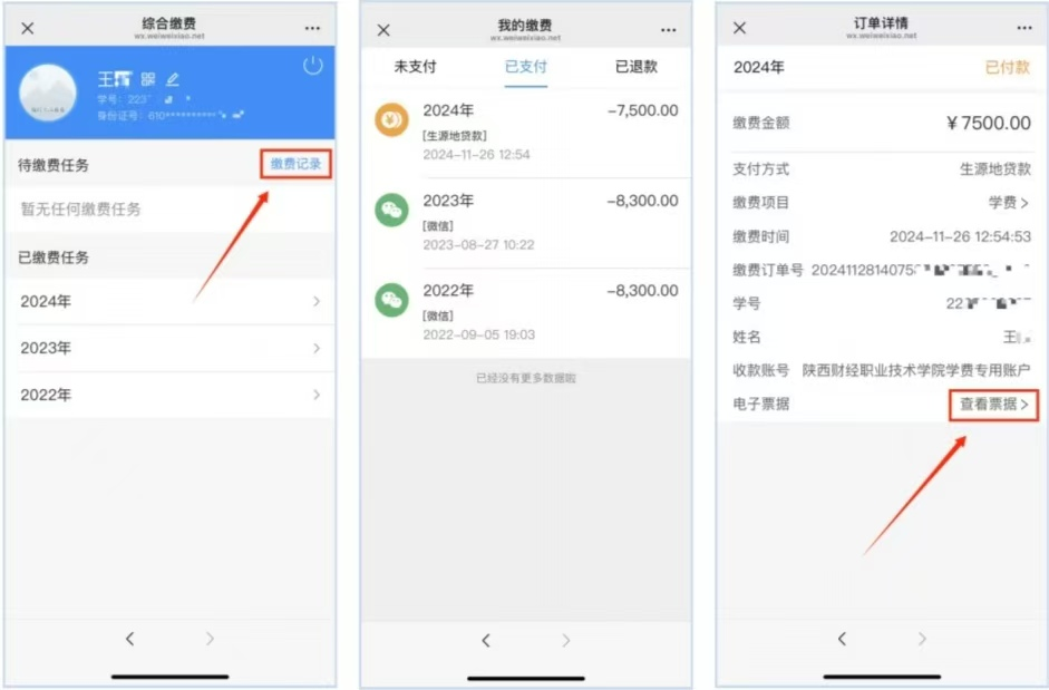 3. 发票查询流程:通过历史缴费订单查询,进入收费系统后点击【缴费记录】—【已支付】,选择需要查看电子票据的任务,进入并点击【查看票据】。
