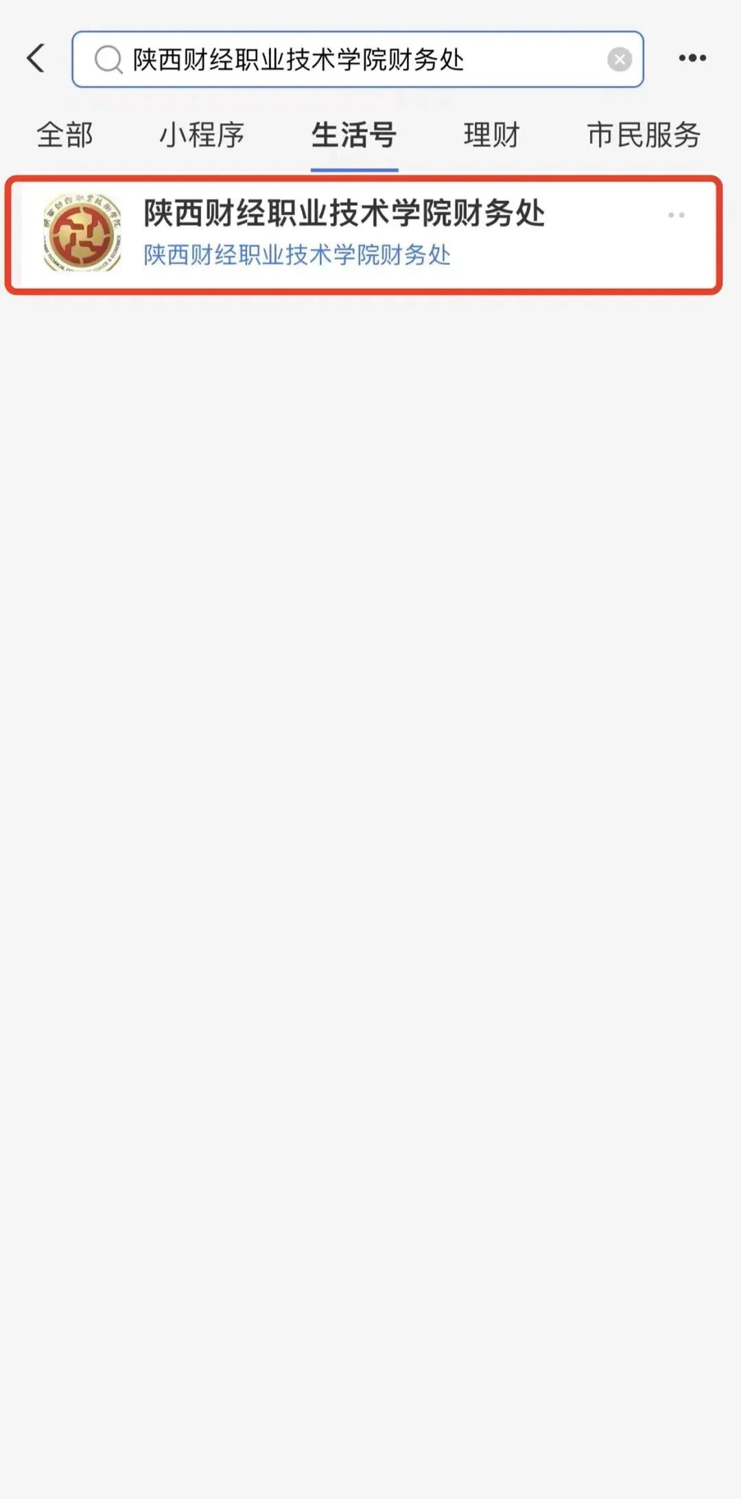 在支付宝生活号中搜索“陕西财经职业技术学院财务处”生活号,关注后点击下方【业务办理】—【缴费大厅】—【学费住宿费教材费】,输入个人身份证号及姓名登录后,根据系统显示收费标准缴费即可。