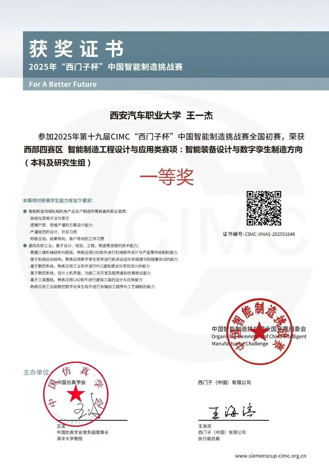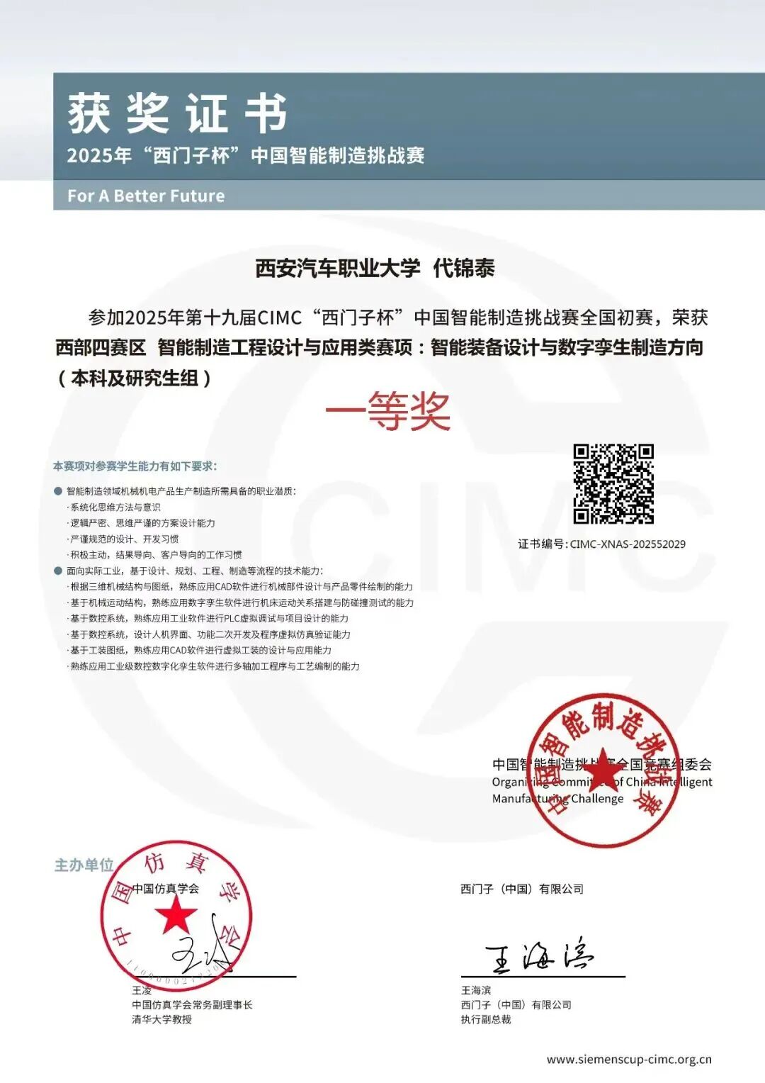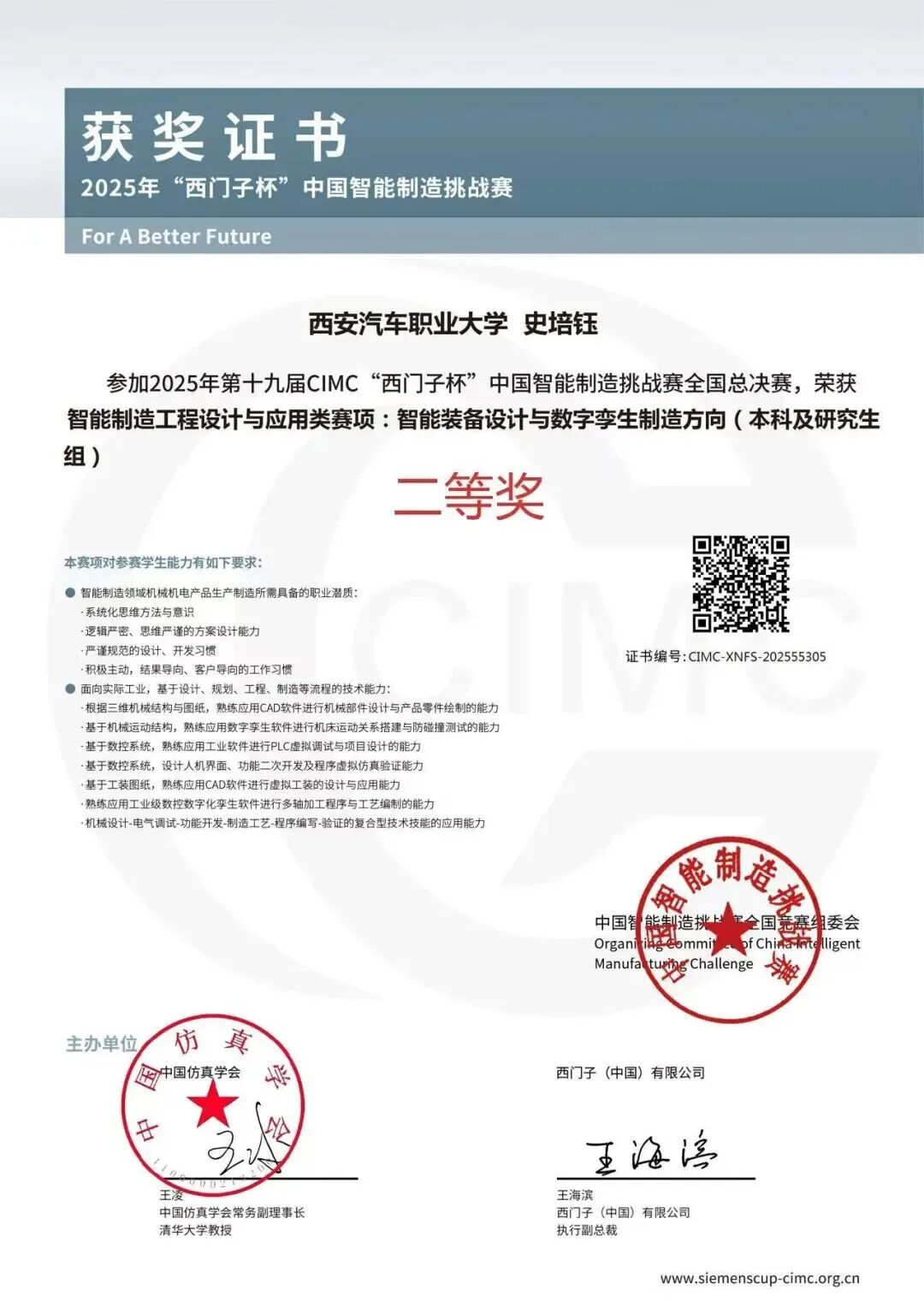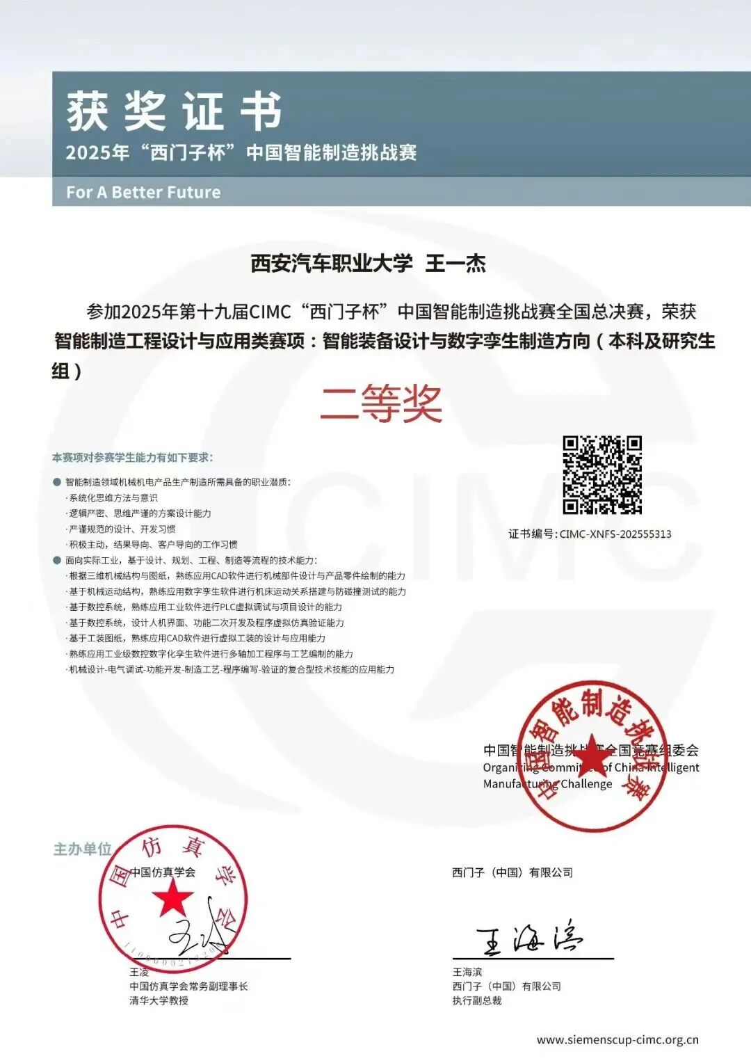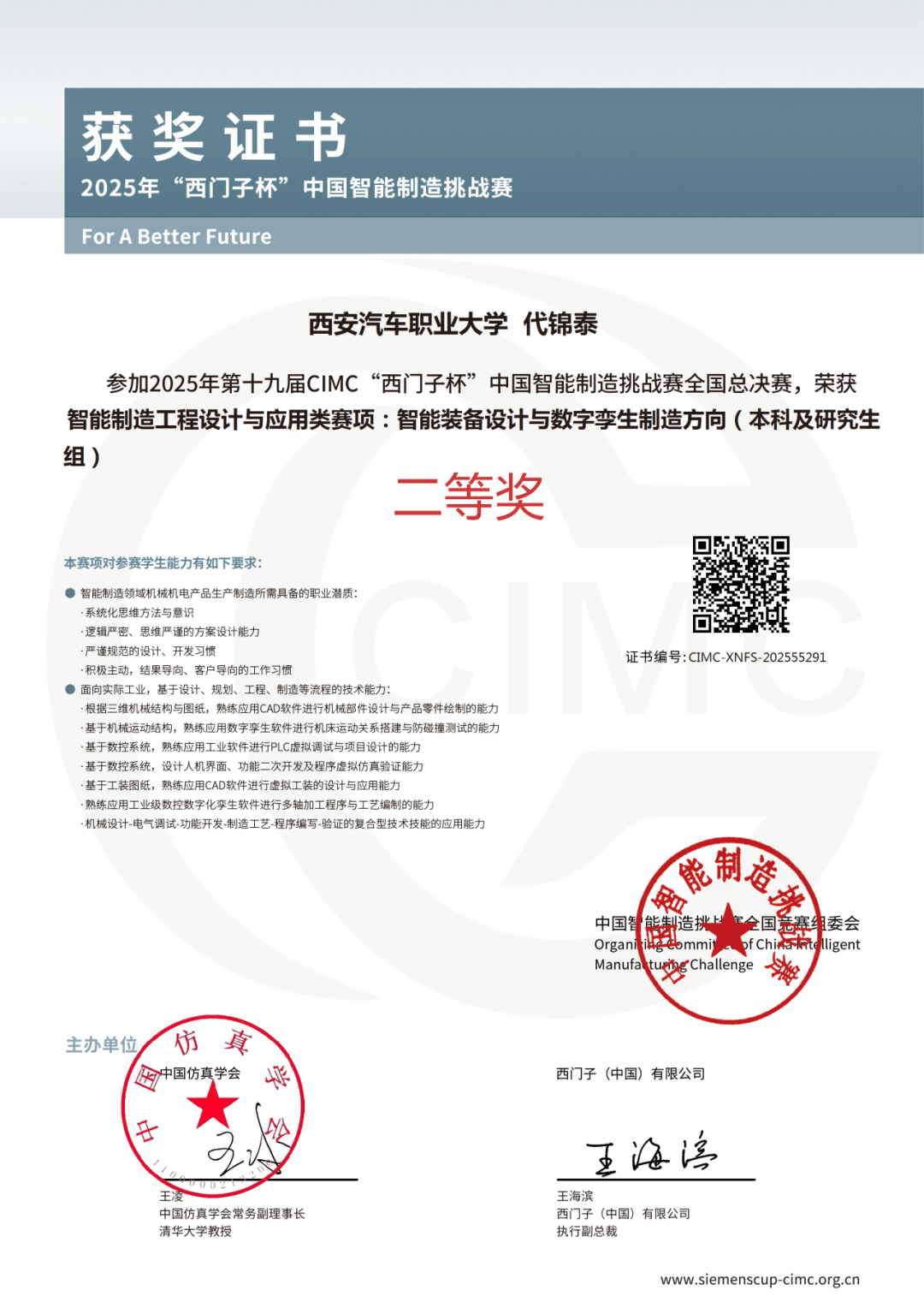 “西门子杯”中国智能制造挑战赛是中国智能制造领域规模最大、规格最高的A类学科竞赛。本届初赛共有来自全国968所高校的10000多支队伍36000余名师生参赛,经过激烈角逐,共有927支队伍脱颖而出晋级全国总决赛。本次全国总决赛共评出本科及研究生组特等奖75项、一等奖217项、二等奖406项。西安汽车职业大学高度重视本次比赛。学校积极组织师生精心筹备、不懈努力,其中代锦泰、王一杰、史培钰三名同学在省赛中表现优异,荣获一等奖并成功晋级全国总决赛。进入全国总决赛后,我校参赛学子稳扎稳打、沉着应战,凭借扎实的理论知识和技能,最终斩获全国总决赛二等奖。