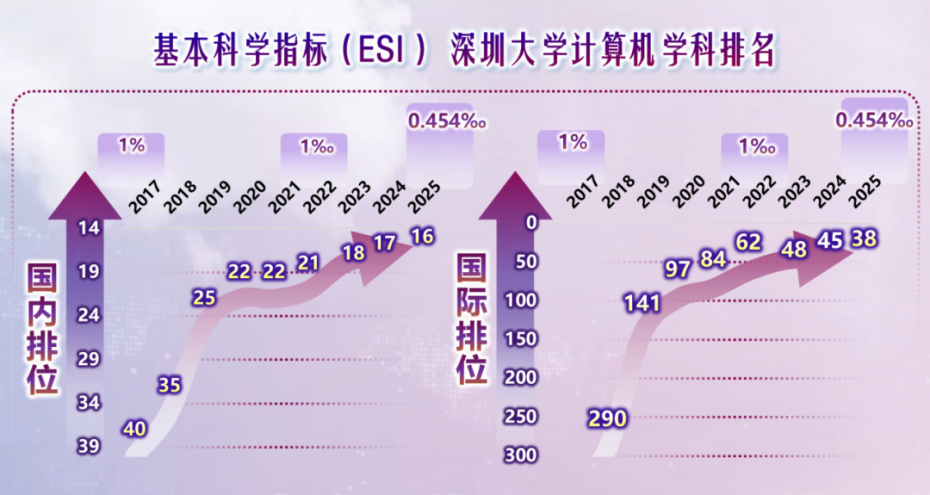 在计算机领域,深大计算机科学学科跻身ESI全球前1‰,在2025CSRankings(Computer Science Rankings)全球计算机科学排名中进入全球百强。明仲教授领衔的团队还入选了第三批“全国高校黄大年式教师团队”。