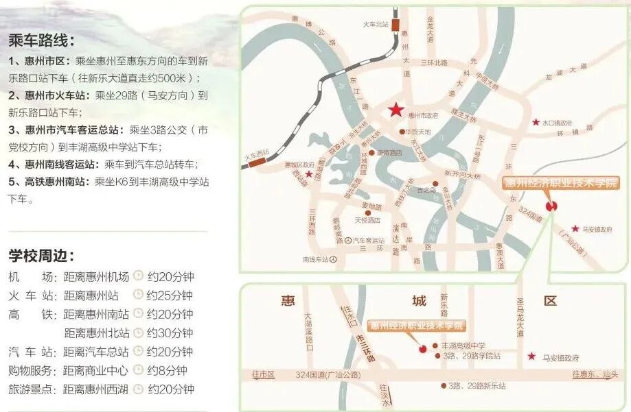 以学校为中心,辐射周边交通,出行快捷便利,方向四通八达。惠州地处铁路重要枢纽,一列列城际轨道、高铁拉近了家校的距离。