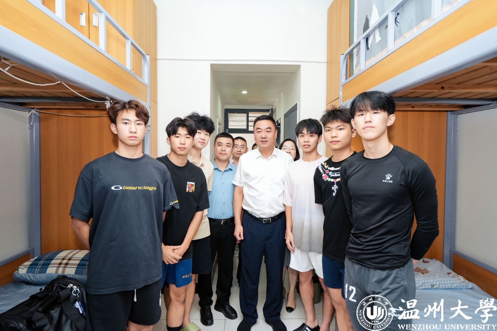 钱强走进体育与健康学院的新生寝室,与浙江省首届足球专业学生交流。“你们是浙江省第一届足球专业的学生,欢迎来到温大!”“大家都来自哪些地方?”“对未来有怎样的职业规划?”每一个问题都饱含着深切期许,“加油,同学们!温州大学足球专业这张新名片,未来就要靠你们去努力打造!”他勉励同学们在文化底蕴深厚的温州勤奋学习、充实生活。