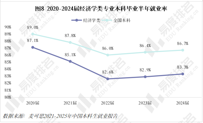 受整体就业形势影响,近年经济学类专业毕业半年就业率下滑严重,从2023届开始有所好转,到2024届毕业半年就业率回升至83.3%,但仍明显低于全国本科平均就业率。