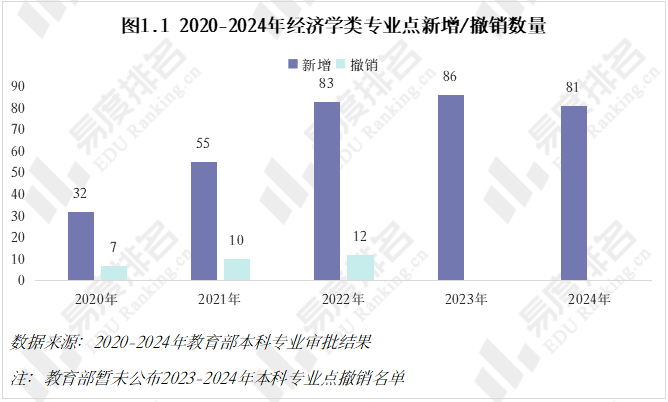 经济学类专业近五年累计新增337个专业点,近三年新增量均维持在80个以上。2020-2022年累计撤销29个专业点,远低于同时期新增数量。