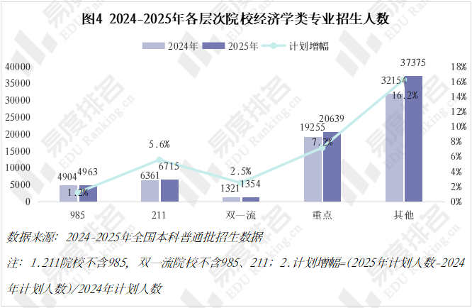 2025年985层次院校经济学类专业招生计划增幅仅1.2%,211及双一流层次院校增幅也较低,经济学类专业计划增幅主要集中在重点及其他层次院校。
