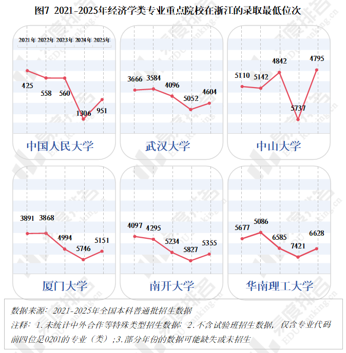 2021-2024年重点高校的经济学类专业在浙江的最低录取位次总体呈下降趋势,但2025年985层次高校计划人数仅增长1.2%,而前一年增幅为5.2%,计划人数的滞涨使得头部院校的录取位次下降趋势出现逆转。