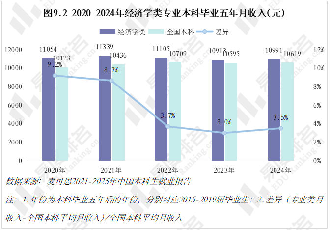 经济学类专业毕业五年后收入在2021年达到峰值,之后开始出现收入下滑现象,下滑幅度虽小,但足以说明经济学类足以已开始走下坡路。