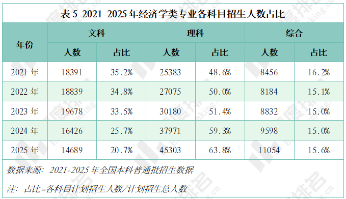 2021-2025年经济学类专业招收理科\物理以及综合考生的计划数显著增长,而招收文科\历史考生的计划数逐渐减少,到2025年经济学类专业招收文科生的占比仅20.7%,而理科生的占比上升至63.8%。