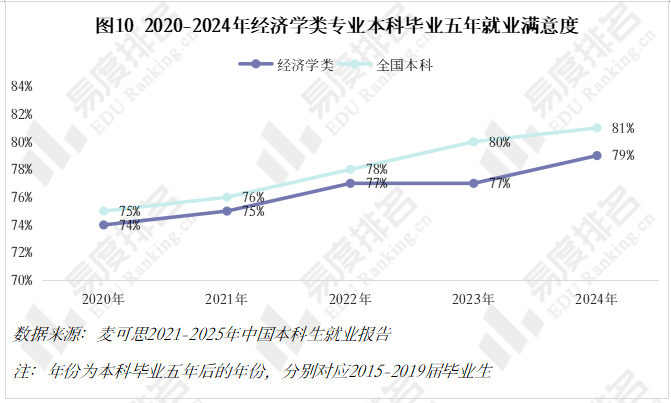 近年经济学类专业毕业五年的就业满意度逐步提升,到2024年毕业五年的满意度升至79%,但始终低于全国本科平均水平。