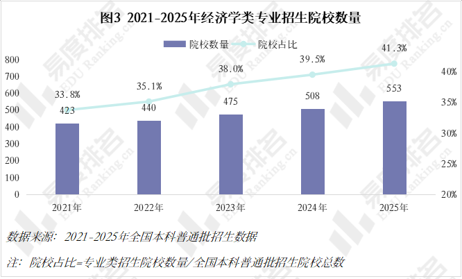 在全国高等教育扩招的大趋势下,开设经济学类专业并有招生计划的高校数量大幅增长,到2025年共有553所本科院校的经济学类专业在全国普通本科批招生,较2021年增加了130所。在本科普通批所有招生院校中的占比也从33.8%上升至41.3%。