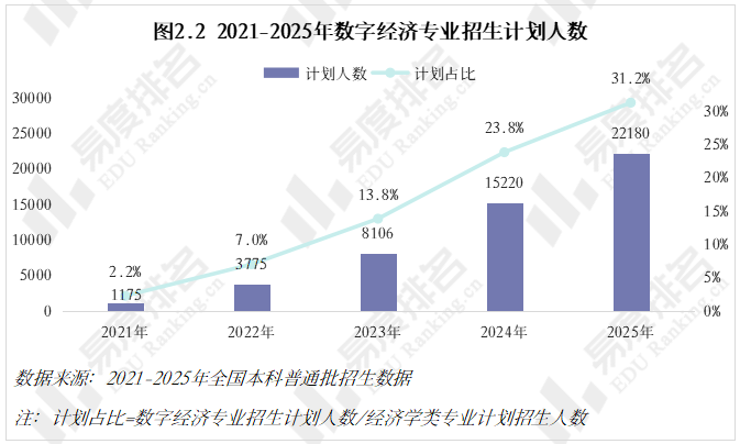 近年数字经济专业招生计划数强势增长,2025年计划招生22180人,较2021年增长了近18倍,该专业计划招生人数在专业类中的占比也从2021年的2.2增长至31.2%,计划人数在经济学类专业中仅次于经济学专业。