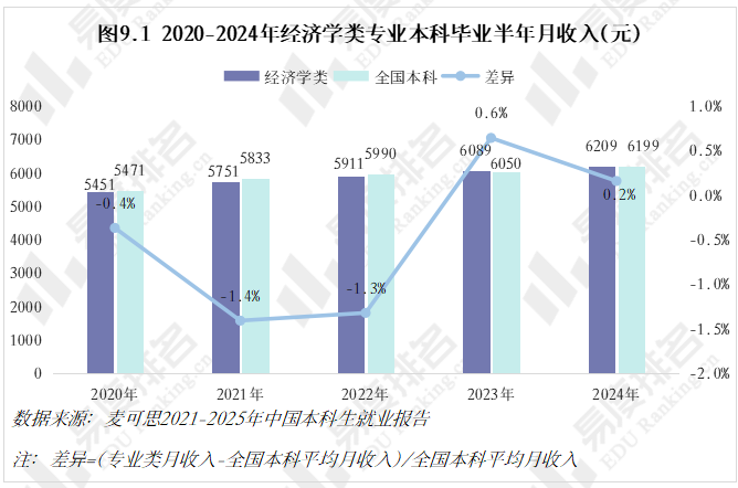 2020-2022年经济学类专业本科毕业半年月收入低于全国本科平均水平,2023年收入反超平均水平,但优势并不明显。